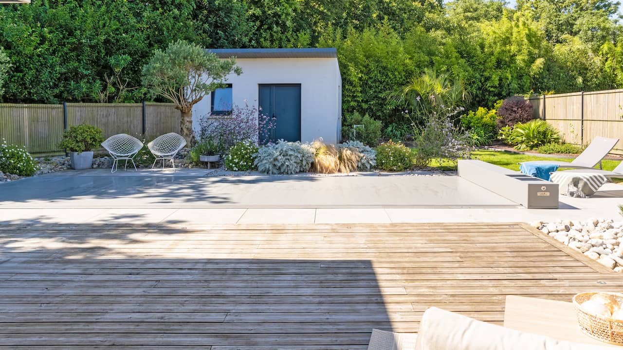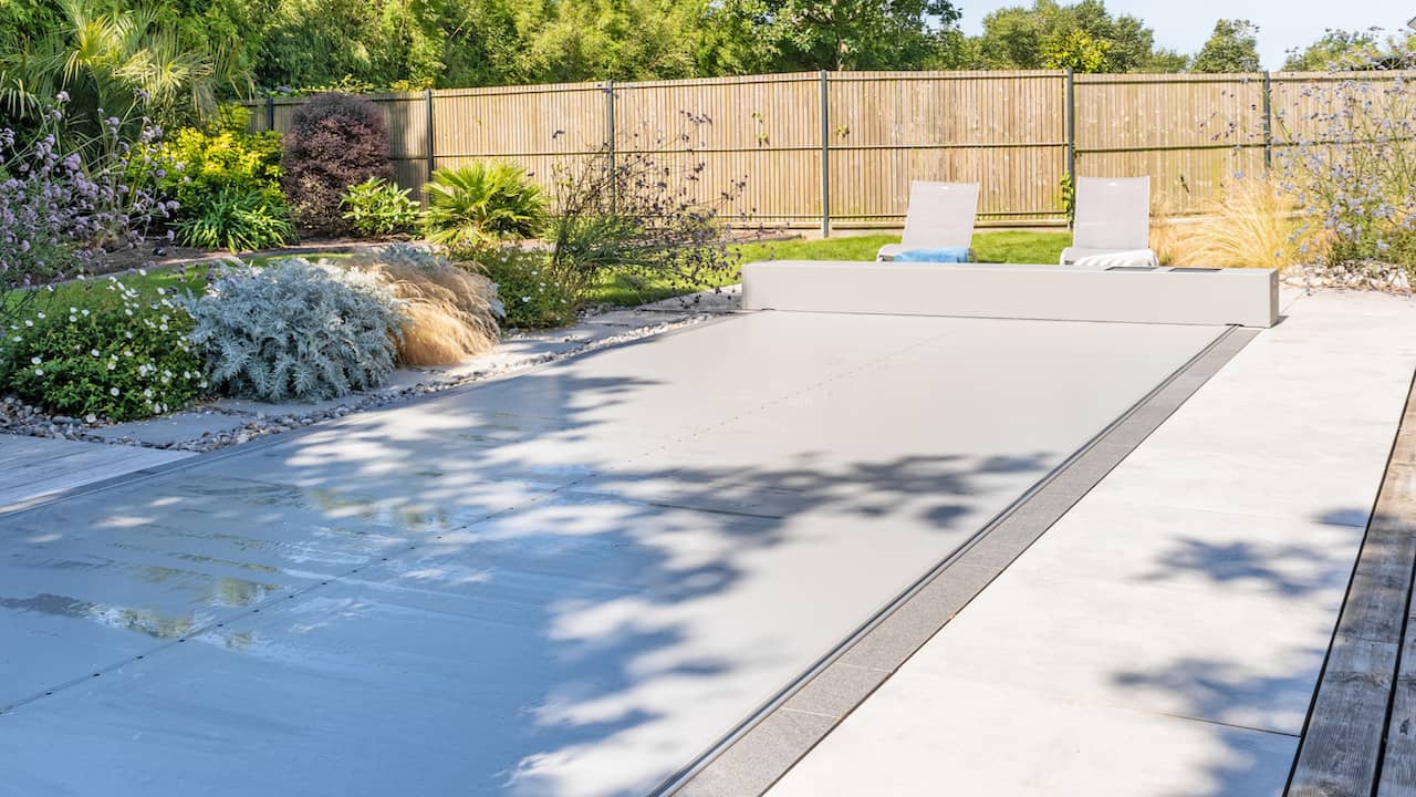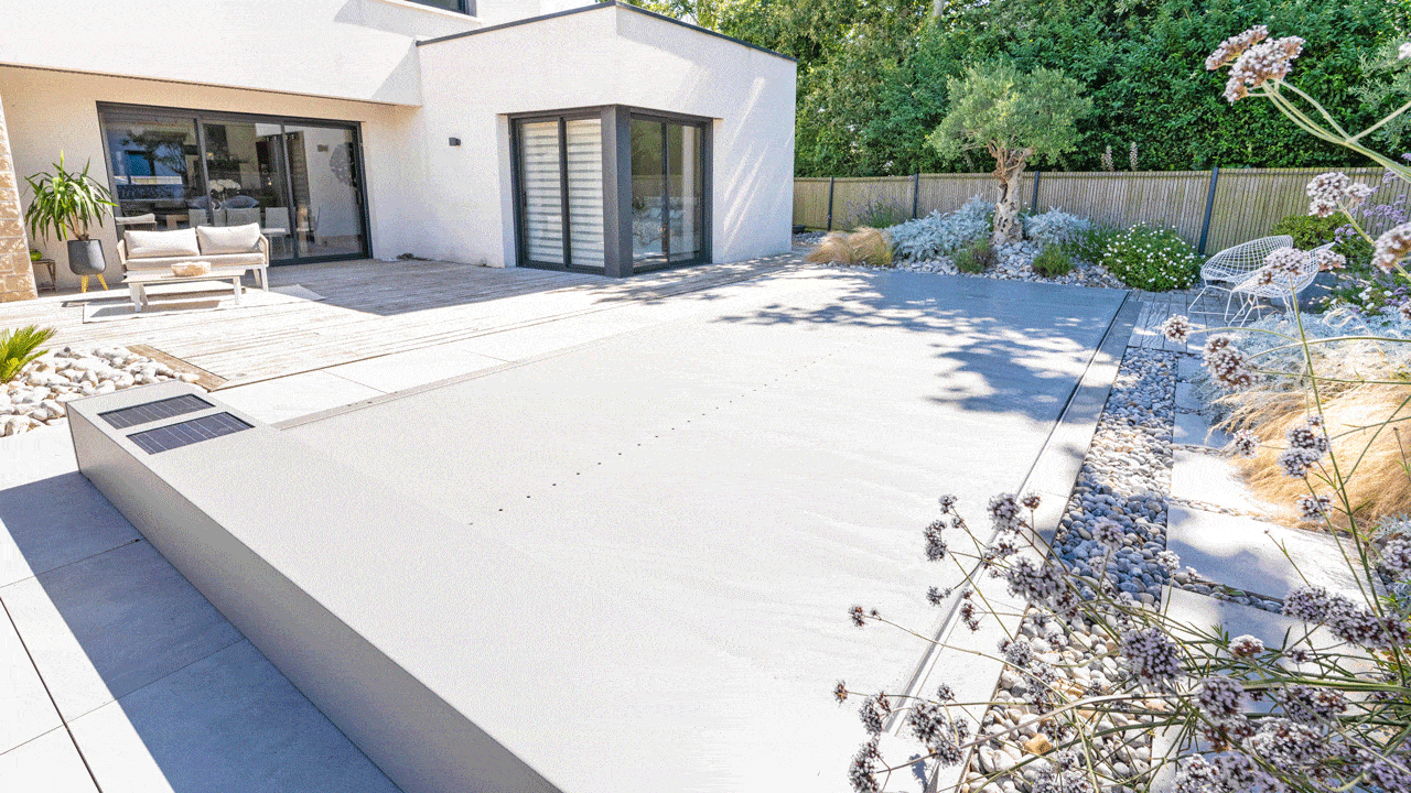 Structure en béton armé isolée. Étanchéité membrane armée 3D 200/100° gris béton. Réseau hydraulique à skimmer. Filtration à verre. 7 x 3 m. Fond plat à 1,5 m. Escalier droit et banquette sur la largueur. Margelles et plage en carrelage. Couverture automatique souple hors sol. Pompe à chaleur inverter.