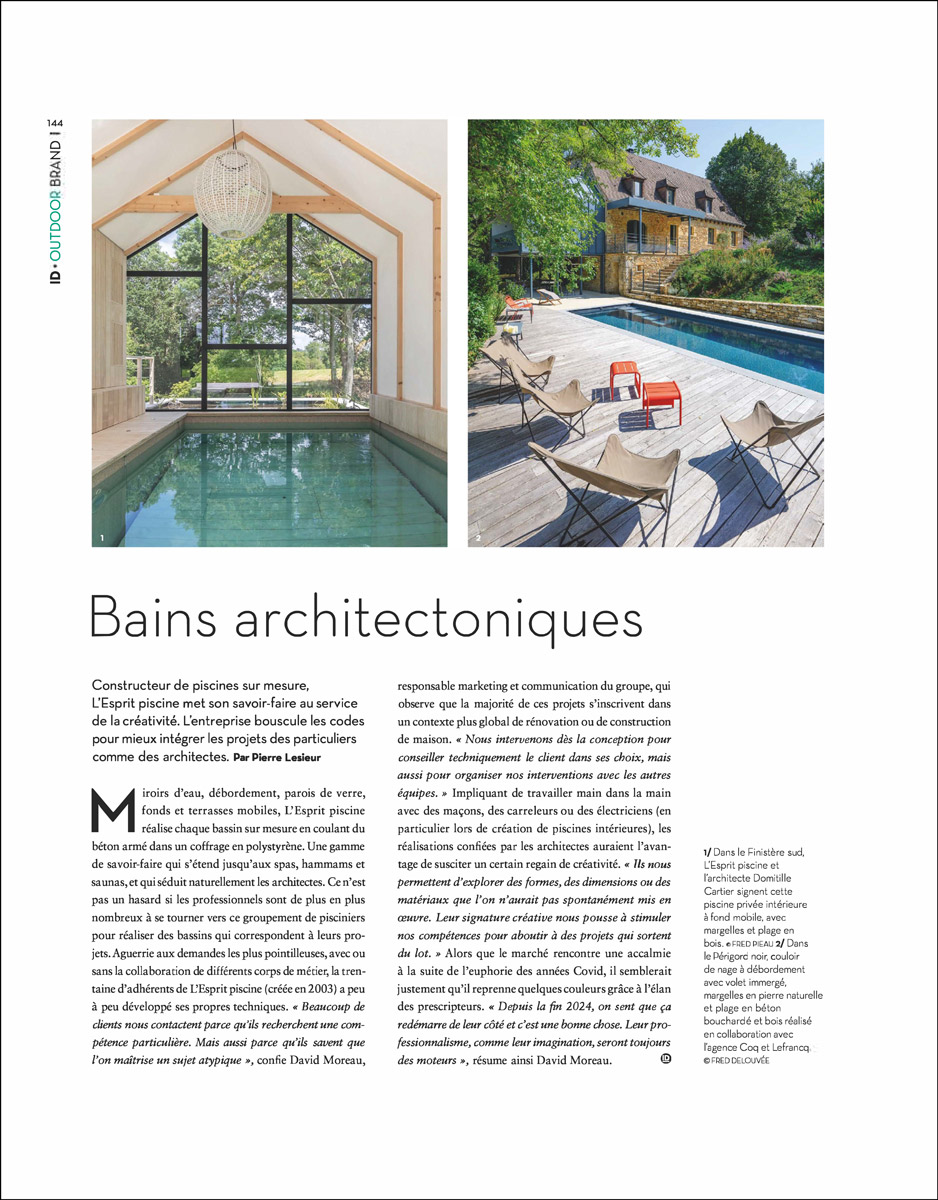 Miroirs d’eau, débordement, parois de verre,fonds et terrasses mobiles, L’Esprit piscineréalise chaque bassin sur mesure en coulant dubéton armé dans un coffrage en polystyrène. Une gammede savoir-faire qui s’étend jusqu’aux spas, hammams etsaunas, et qui séduit naturellement les architectes. Ce n’estpas un hasard si les professionnels sont de plus en plusnombreux à se tourner vers ce groupement de piscinierspour réaliser des bassins qui correspondent à leurs projets.Aguerrie aux demandes les plus pointilleuses, avec ousans la collaboration de différents corps de métier, la trentained’adhérents de L’esprit piscine (créée en 2003) a peuà peu développé ses propres techniques. « Beaucoup declients nous contactent parce qu’ils recherchent une compétenceparticulière. Mais aussi parce qu’ils savent quel’on maîtrise un sujet atypique », confie David Moreau,responsable marketing et communication du groupe, quiobserve que la majorité de ces projets s’inscrivent dansun contexte plus global de rénovation ou de constructionde maison. « Nous intervenons dès la conception pourconseiller techniquement le client dans ses choix, maisaussi pour organiser nos interventions avec les autreséquipes. » Impliquant de travailler main dans la mainavec des maçons, des carreleurs ou des électriciens (enparticulier lors de création de piscines intérieures), lesréalisations confiées par les architectes auraient l’avantagede susciter un certain regain de créativité. « Ils nous permettent d’explorer des formes, des dimensions ou desmatériaux que l’on n’aurait pas spontanément mis enœuvre. Leur signature créative nous pousse à stimulernos compétences pour aboutir à des projets qui sortentdu lot. » Alors que le marché rencontre une accalmieà la suite de l’euphorie des années Covid, il sembleraitjustement qu’il reprenne quelques couleurs grâce à l’élandes prescripteurs. « Depuis la fin 2024, on sent que çaredémarre de leur côté et c’est une bonne chose. Leur professionnalisme,comme leur imagination, seront toujoursdes moteurs », résume ainsi David Moreau.