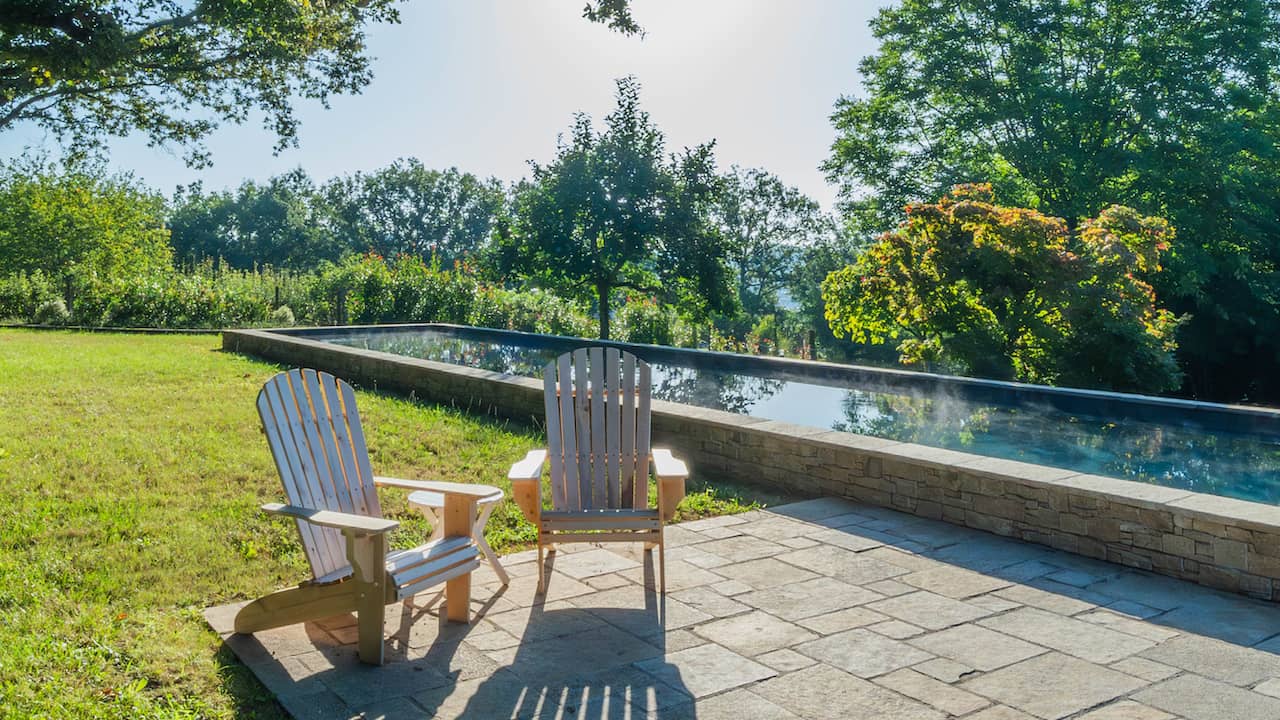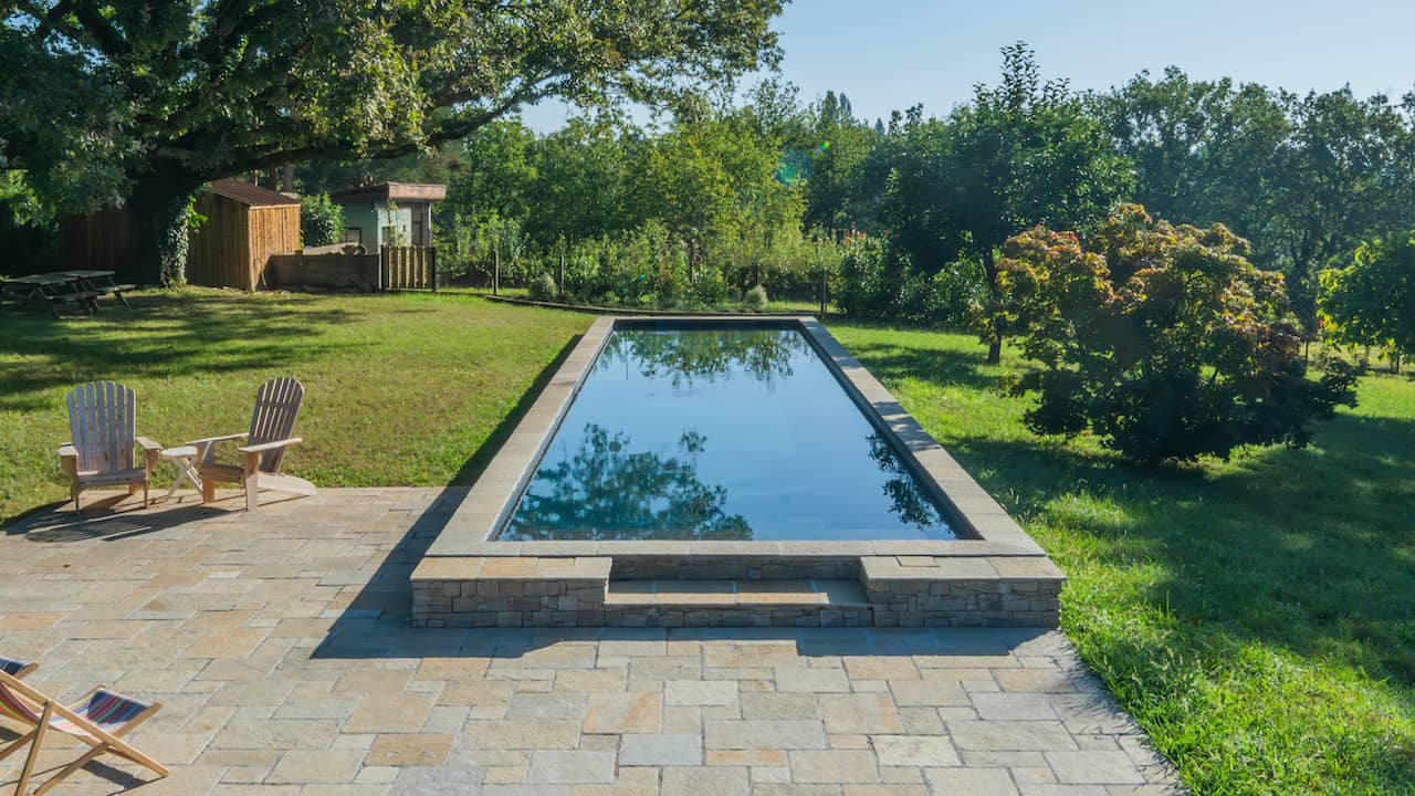Structure en béton armée isolé. Étanchéité membrane armée 3D 200/100° gris ardoise. Réseau hydraulique à skimmer. Filtration à verre. 18,00 x 3,50 m. Fond plat à 1,50 m. Escalier droit sur la largeur. Margelles et plage en pierre naturelle. Volet immergé. Électrolyseur. Chauffage pompe à chaleur. Trophée d’or FPP 2025 du couloir de nage.