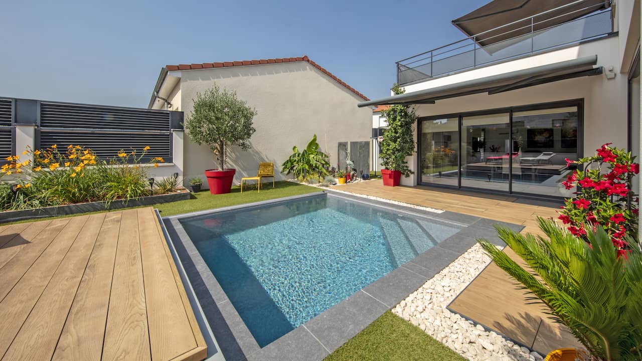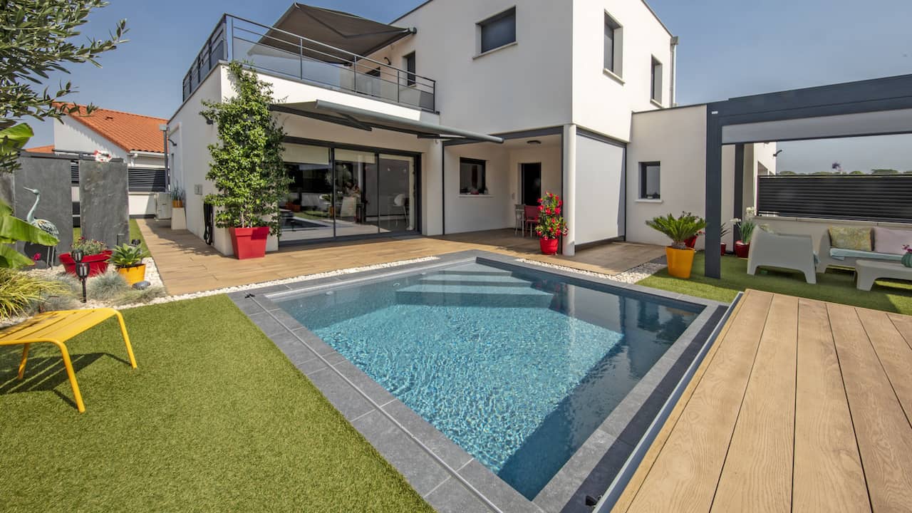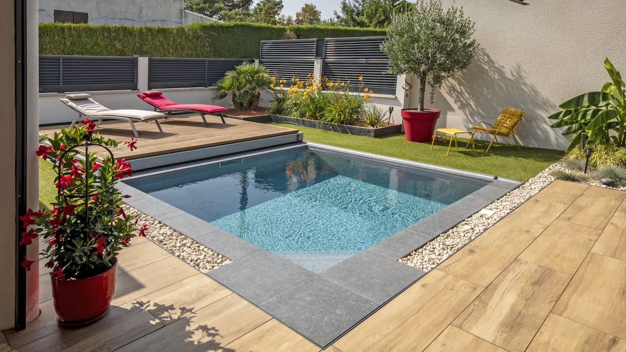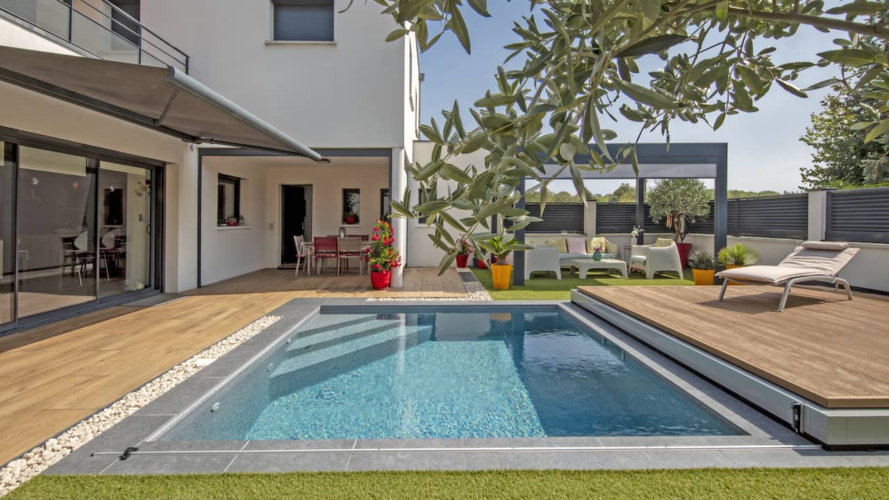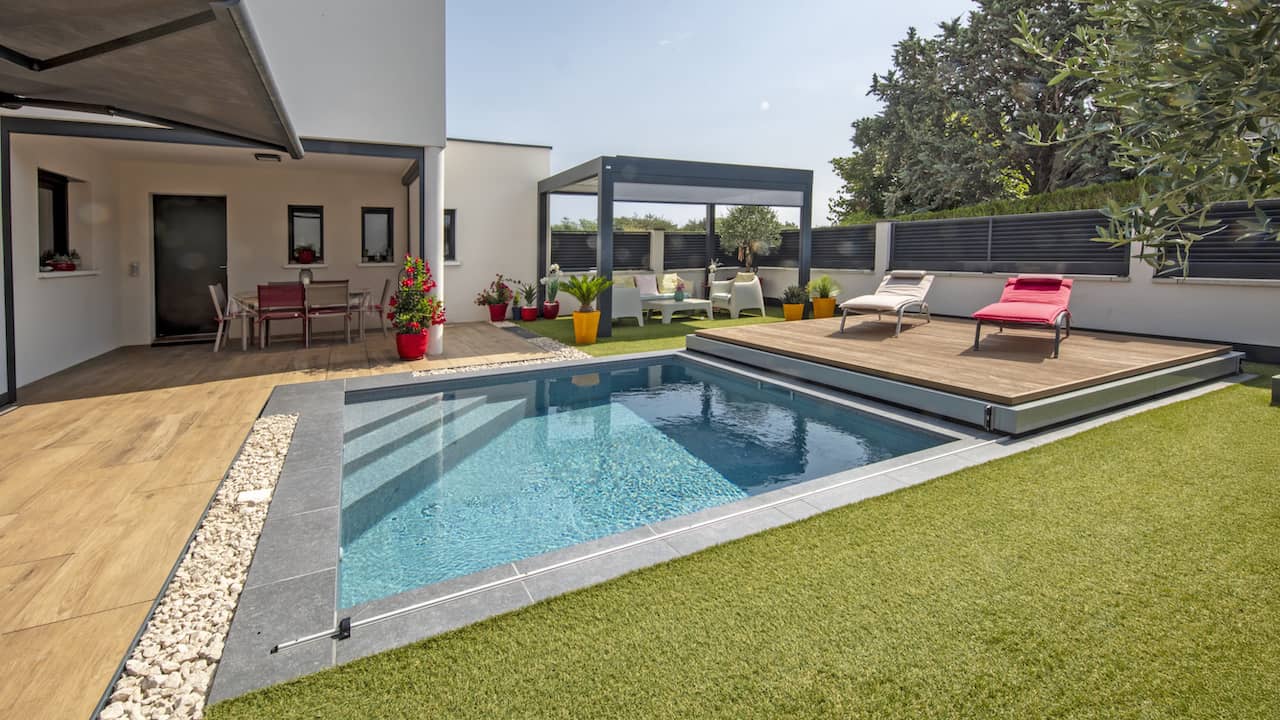 Structure en béton armé isolée. Étanchéité membrane armée 3D 200/100° gris béton. Réseau hydraulique à skimmer. Filtration à sable. 3,5 x 3,5 m. Fond plat à 1,35 m. Escalier d’angle. Margelles en céramique. Terrasse mobile. Régulation automatique. Électrolyseur. Pompe à chaleur inverter.