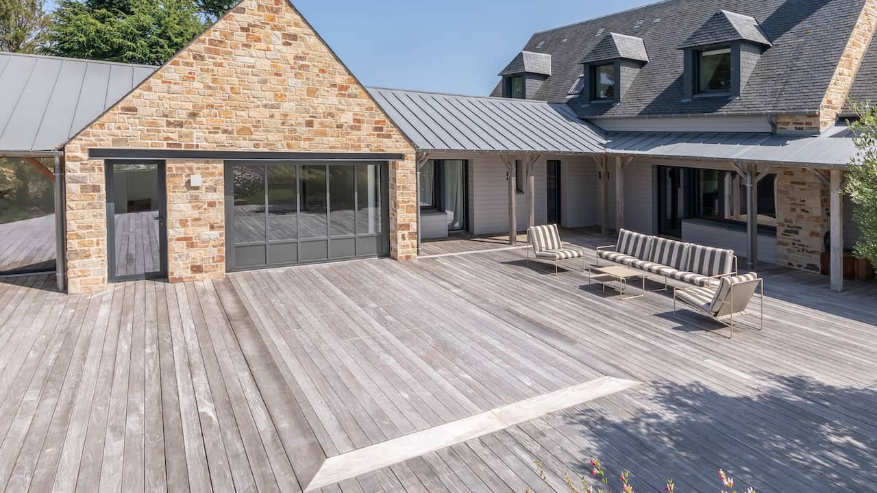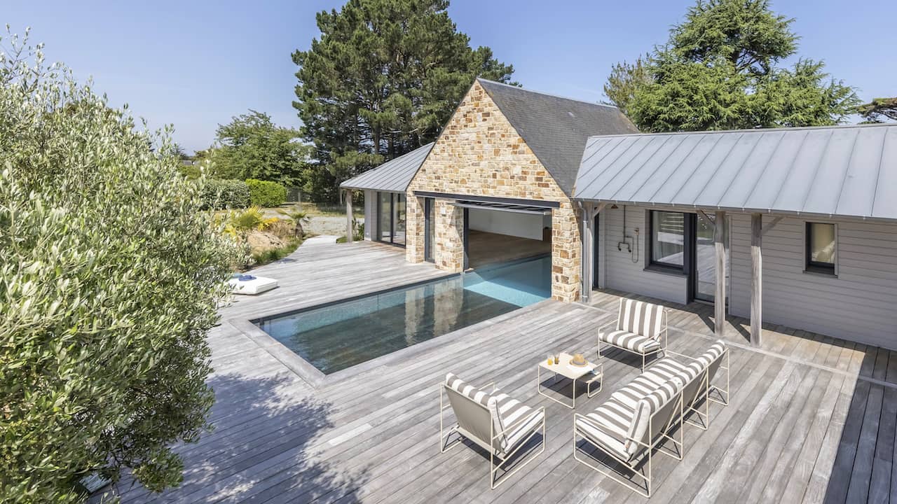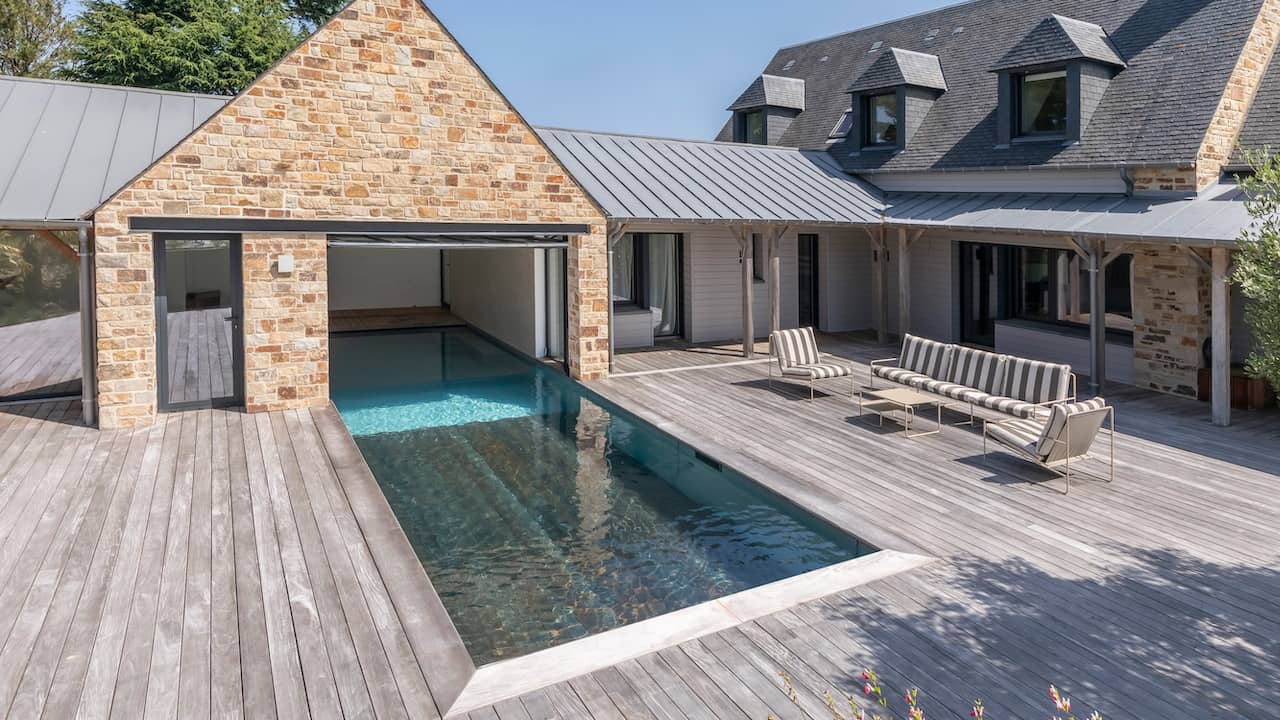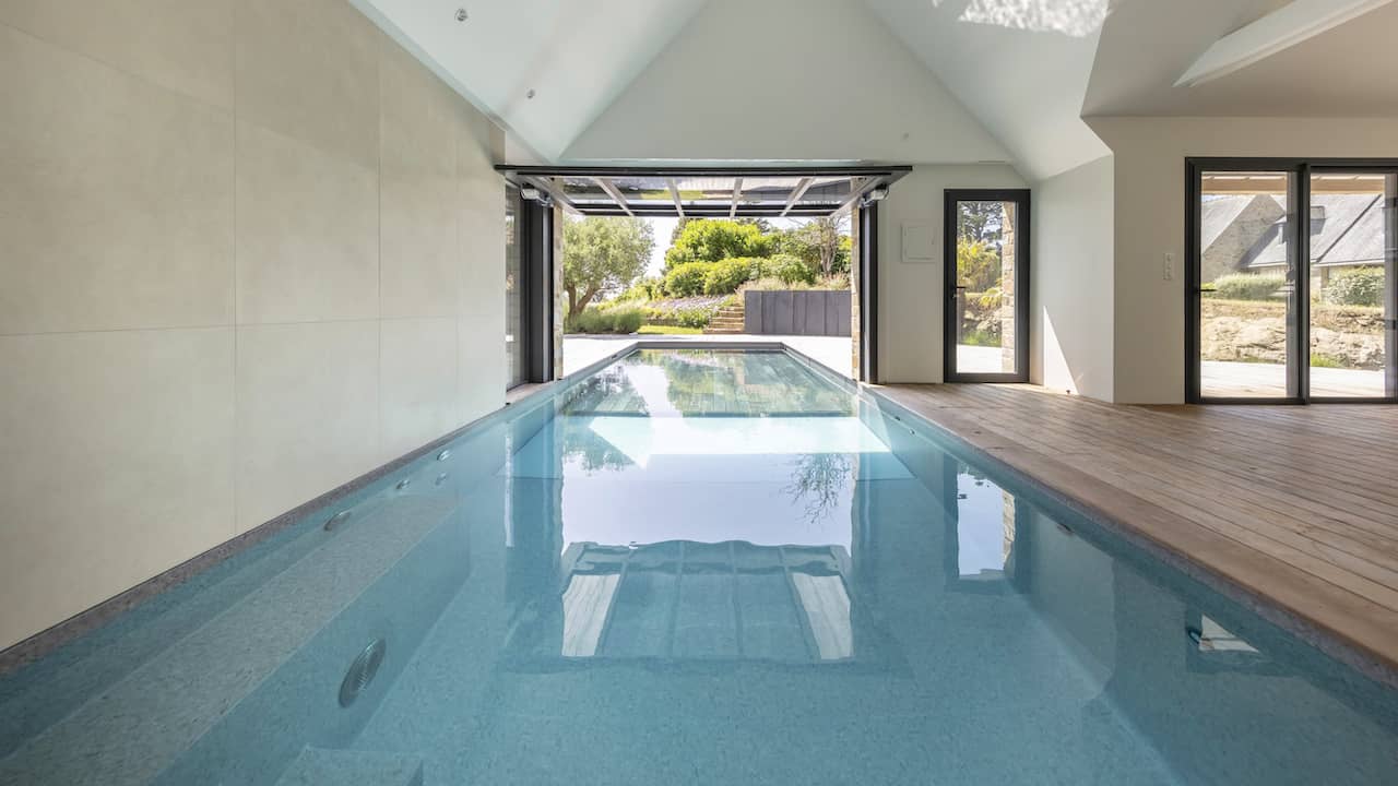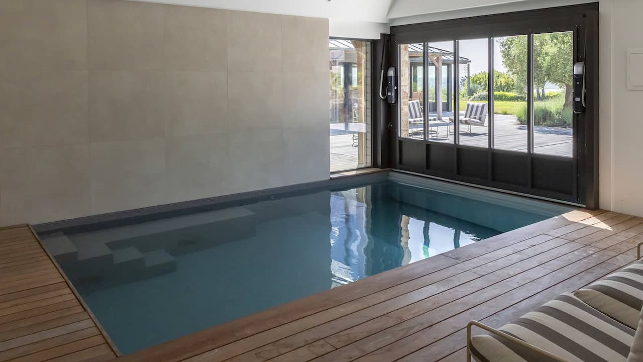 Structure en béton. Étanchéité membrane armée 3D 200/100° gris béton. Réseau hydraulique à skimmer. Filtration à sable. 11 x 3,5 m. Fond plat. Escalier droit avec petite banquette sur la longueur. Margelles et plage en bois. Volet immergé. Fond mobile. Régulation automatique et stérilisateur UV. Pompe à chaleur inverter. Déshumidification par réseau de gaines. Projecteurs. Hydrojets.