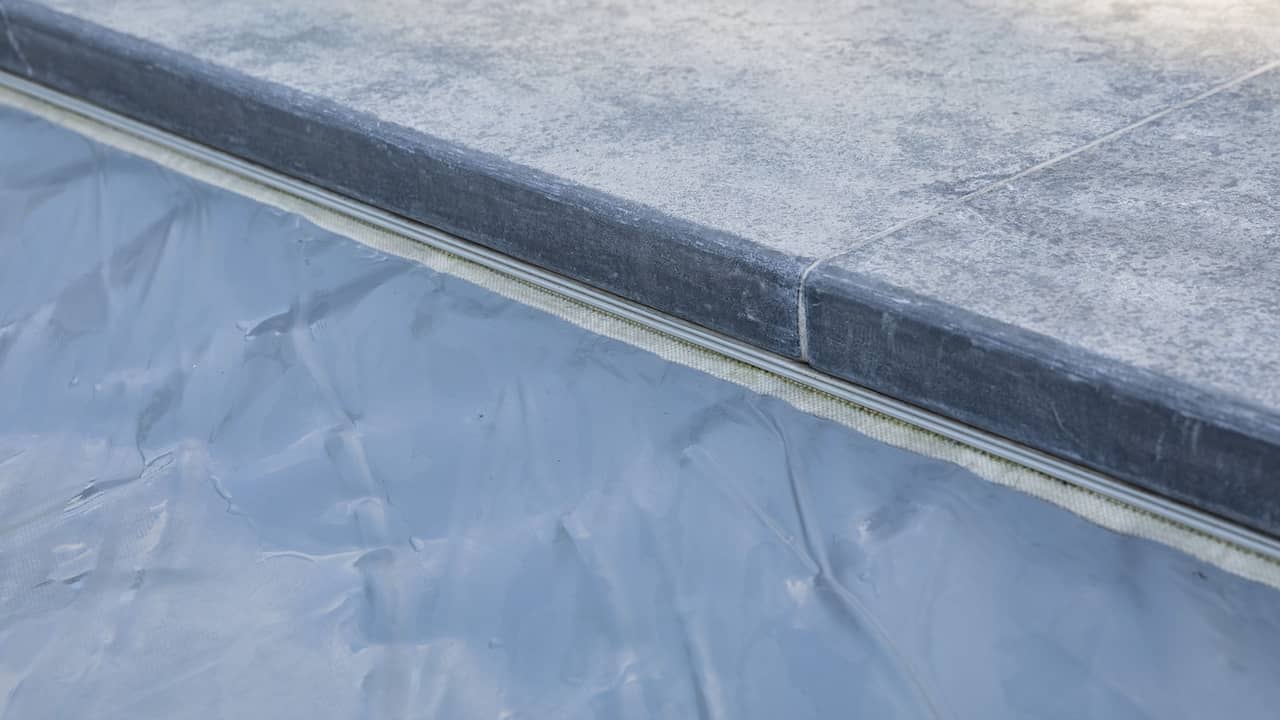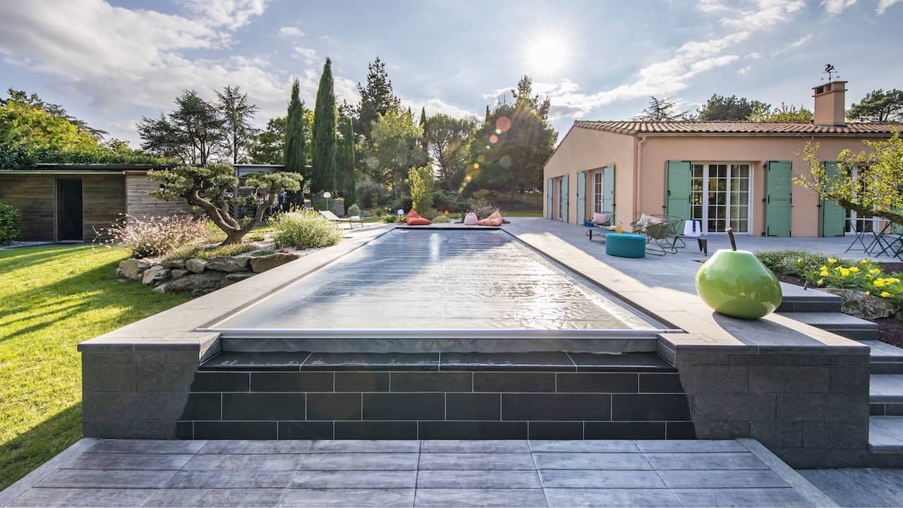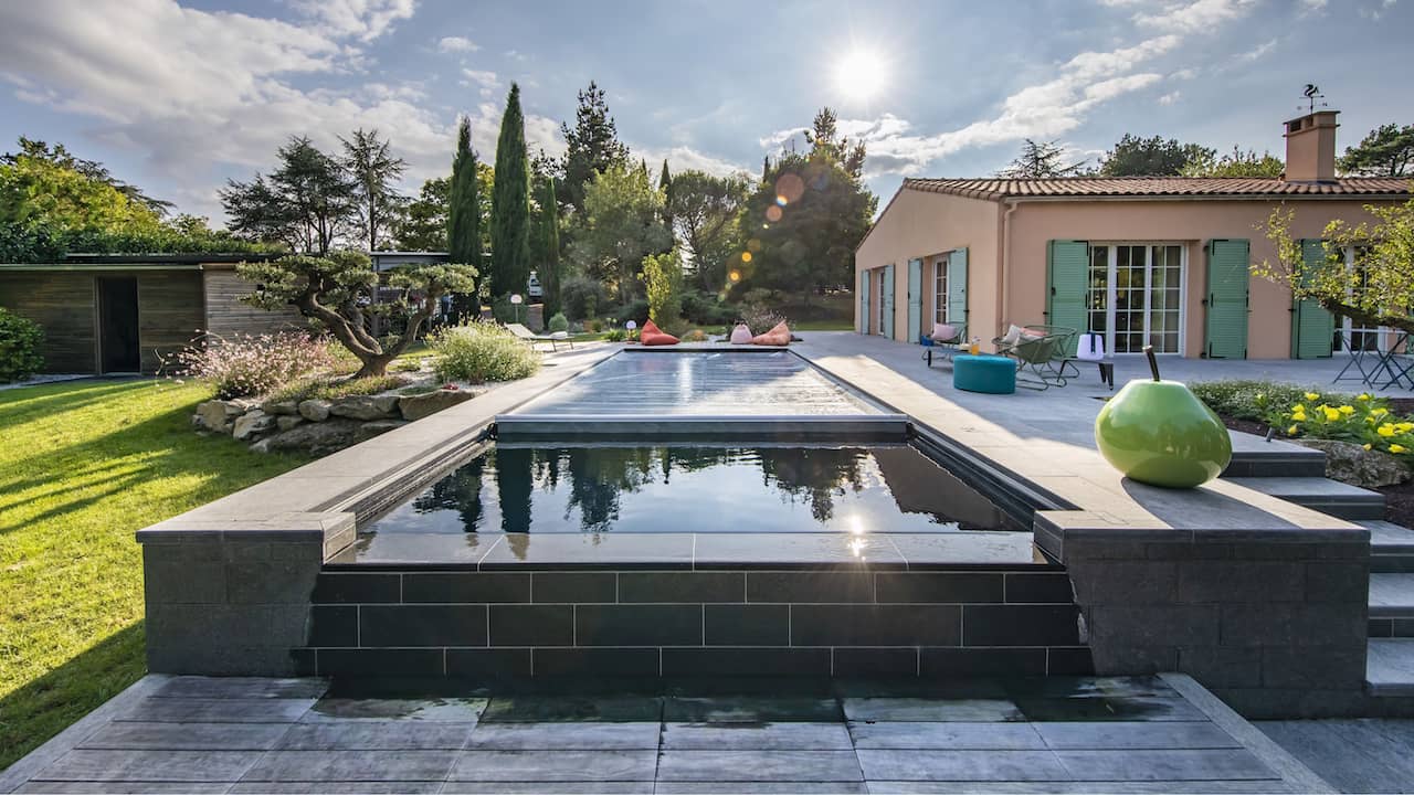 Structure béton armé isolé. Etanchéité membrane armée 3D 200/100° gris ardoise. Réseau hydraulique à surverse. Filtration à verre. 9 x 4 m. Fond en pente composée de 1,30 à 1,85 m. Escalier d’angle. Margelles en pierre bleue. Plage en pierre bleue et en bois (pin). Couverture automatique intégrée. Régulation automatique. Chauffage pompe à chaleur inverter. Projecteurs.