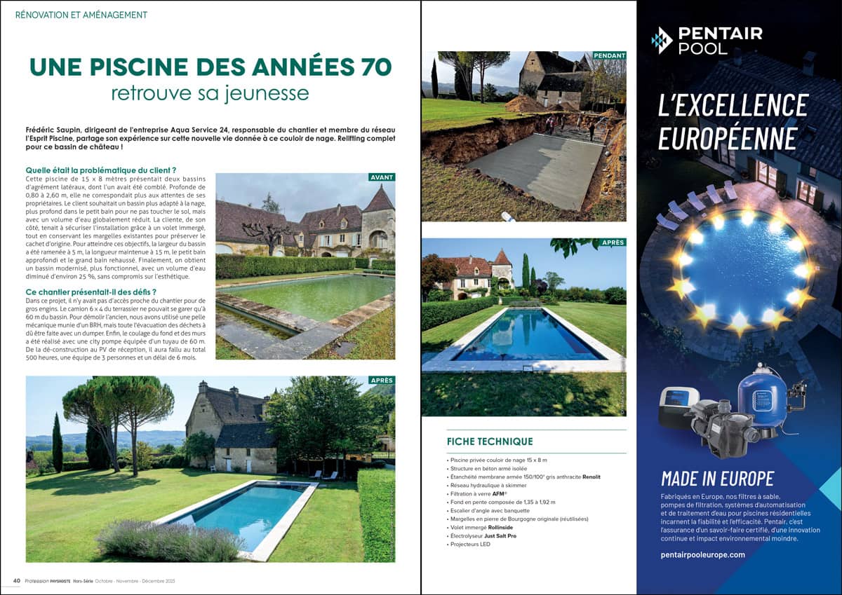 Frédéric Saupin, dirigeant de l’entreprise Aqua Service 24, responsable du chantier et membre du réseau l’Esprit Piscine, partage son expérience sur cette nouvelle vie donnée à ce couloir de nage. Relifting complet pour ce bassin de château !
